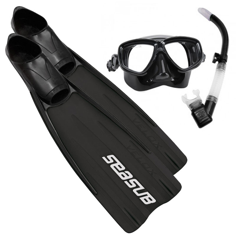 O kit contém um par de pé de patos, óculos aquáticos e um respirador por apenas R$ 249,90